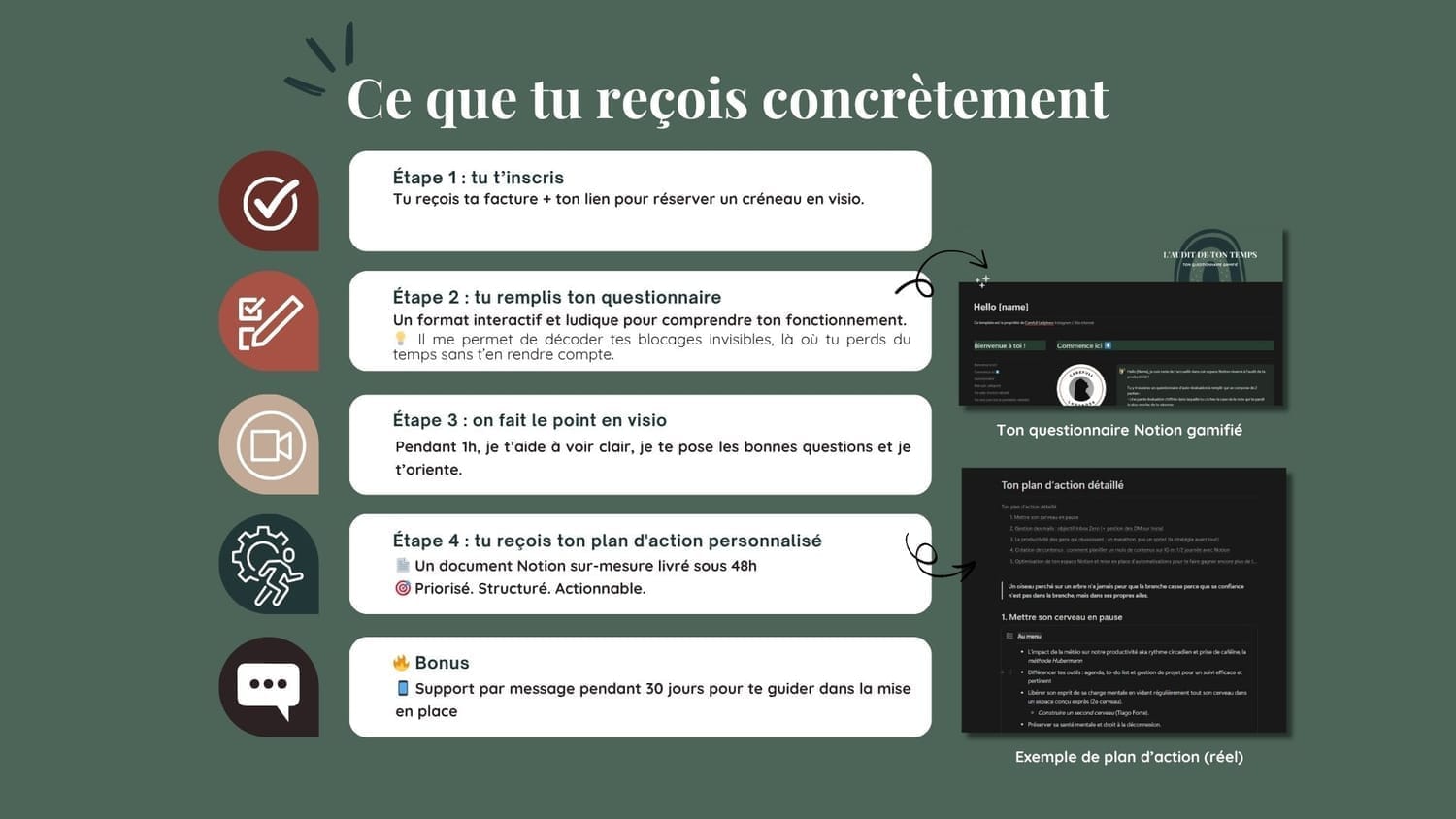 Je te propose en complément un accompagnement 1:1 durant 3 mois après l'audit de ta situation, des visios pour suivre ton avancée et la création de ton espace Notion sur mesure en fonction de tes besoins et de ta maîtrise de l'outil !